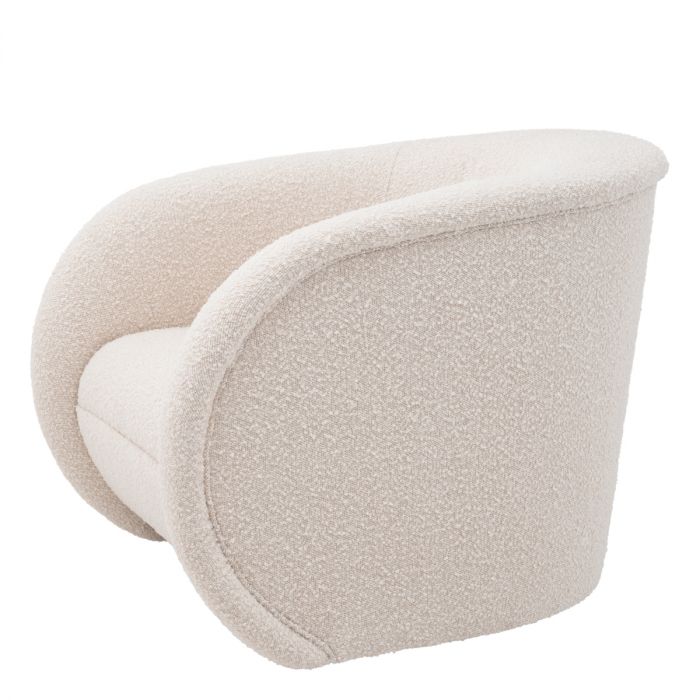 Enjoy the soft embrace of the curvy Chair Cristo in our faux fur Boucle cream fabric with a round brushed brass swivel base. The impressive styling of this graceful recliner flows a sheltering arc from arm to back, around a circular seat. It will be a glamorous and comfortable addition to the seating area in a nook of your bedroom.